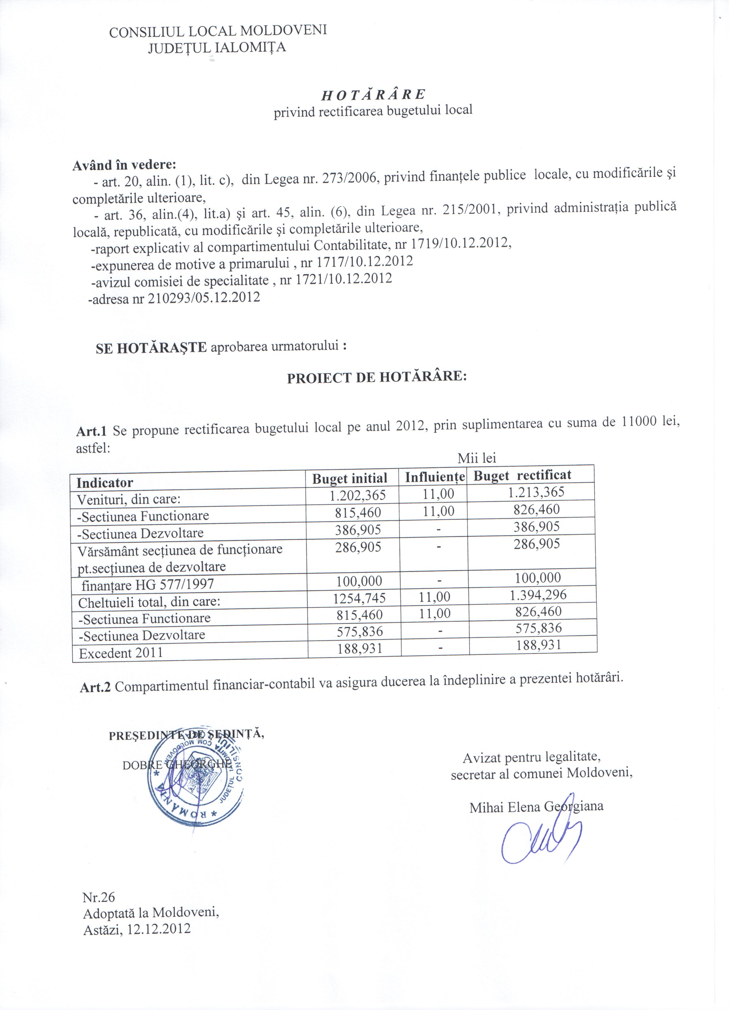 - Hot. nr. 01/09.12.2012 privind acop. deficitului bug. sectiunea dezv. pe anul 2012 din excedentul bug. loc. pe anul 2011.