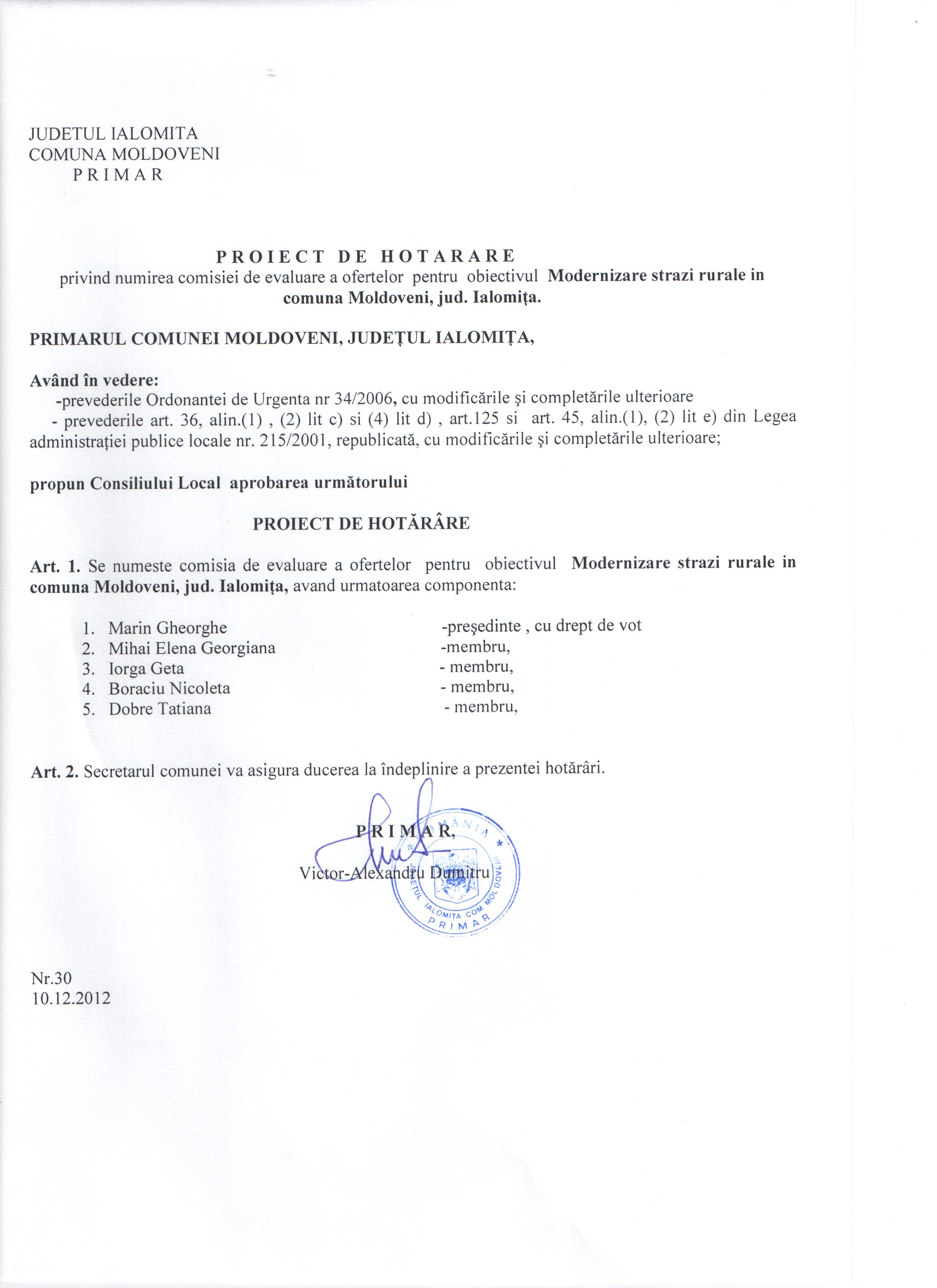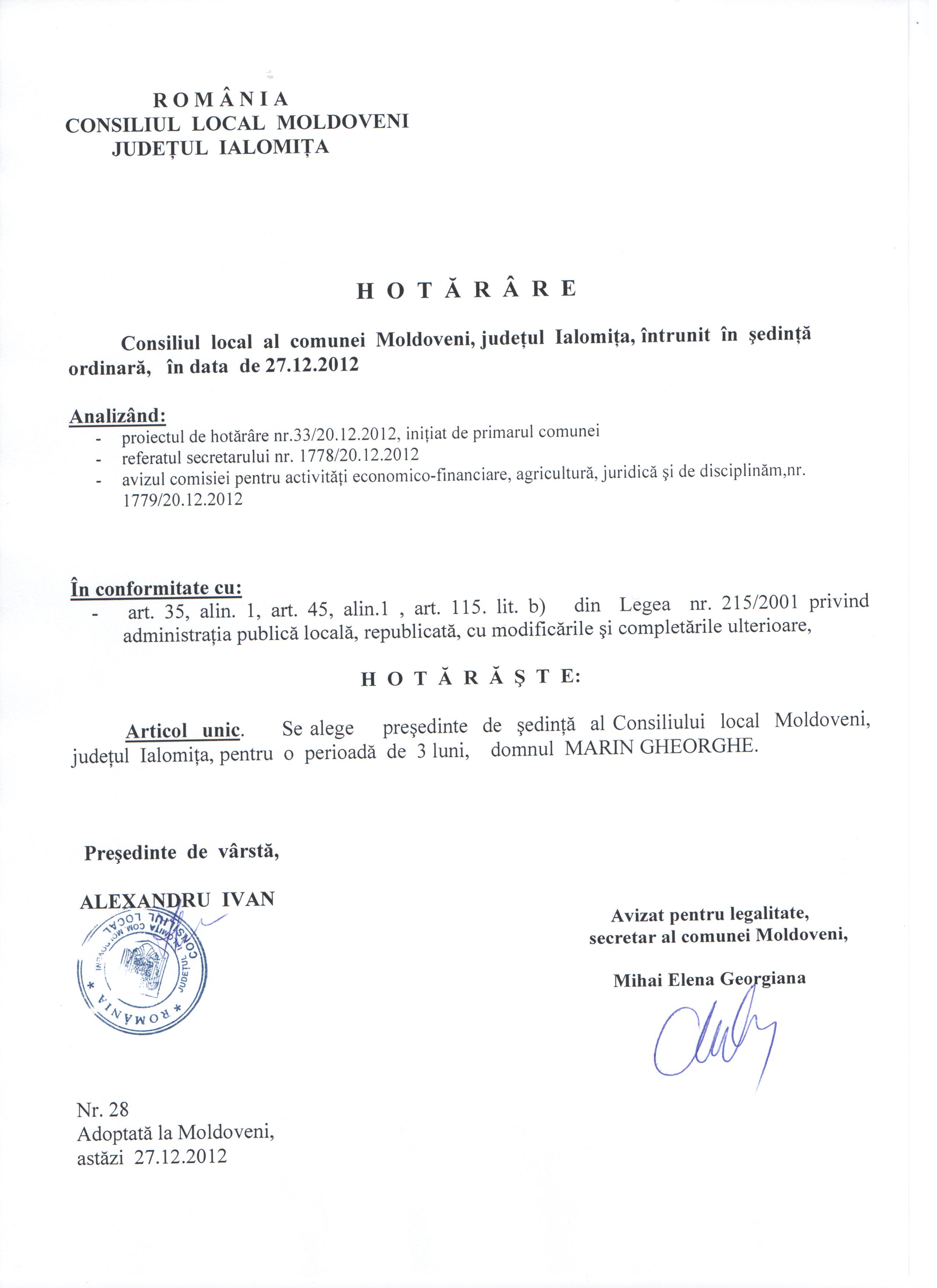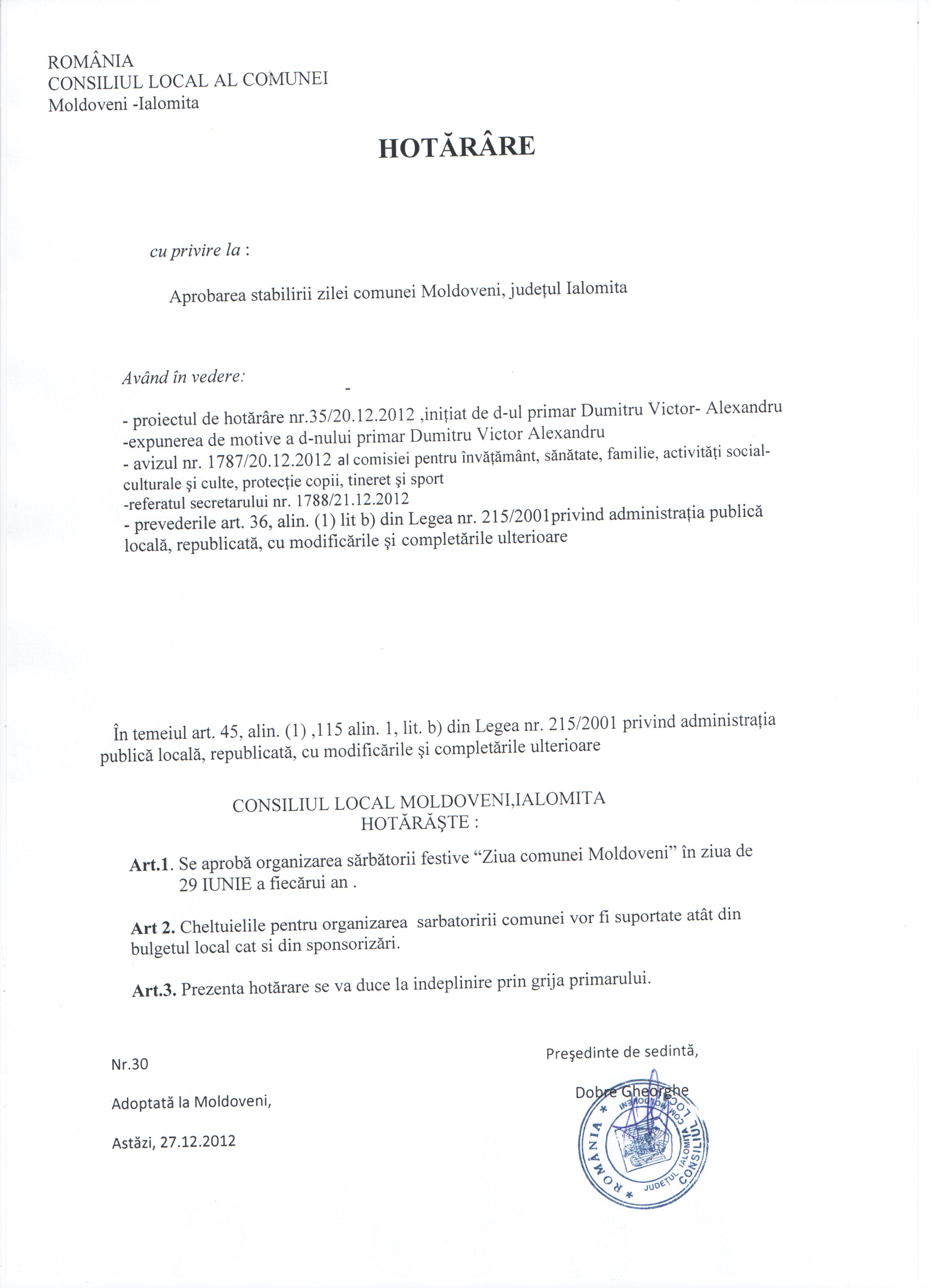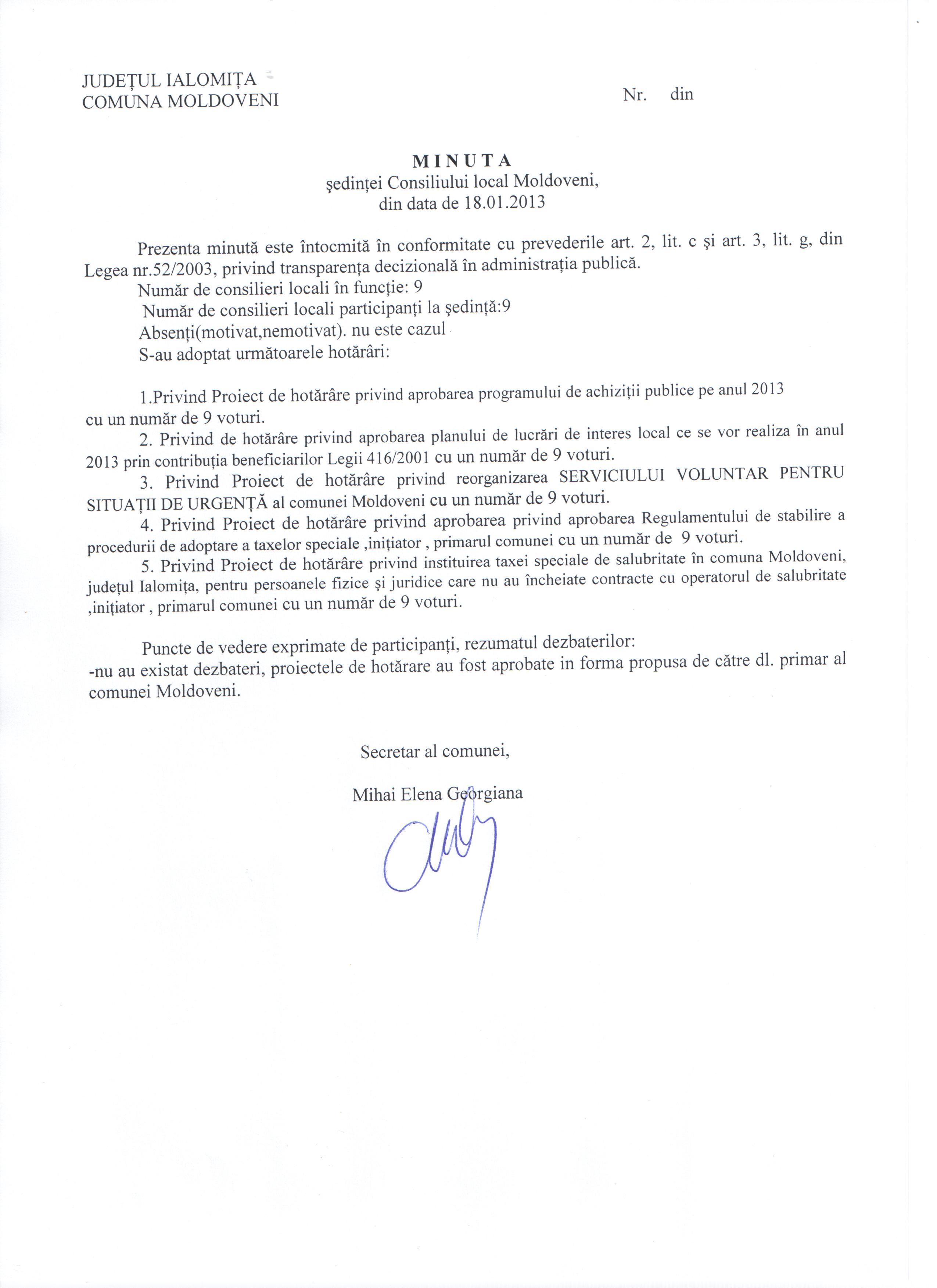 - Hot. nr. 22/17.05.2013 privind modificarea şi completarea Hotărârii Consiliului Local nr. 19/20.09.2010 ,Moldoveni-Ialomiţa.
