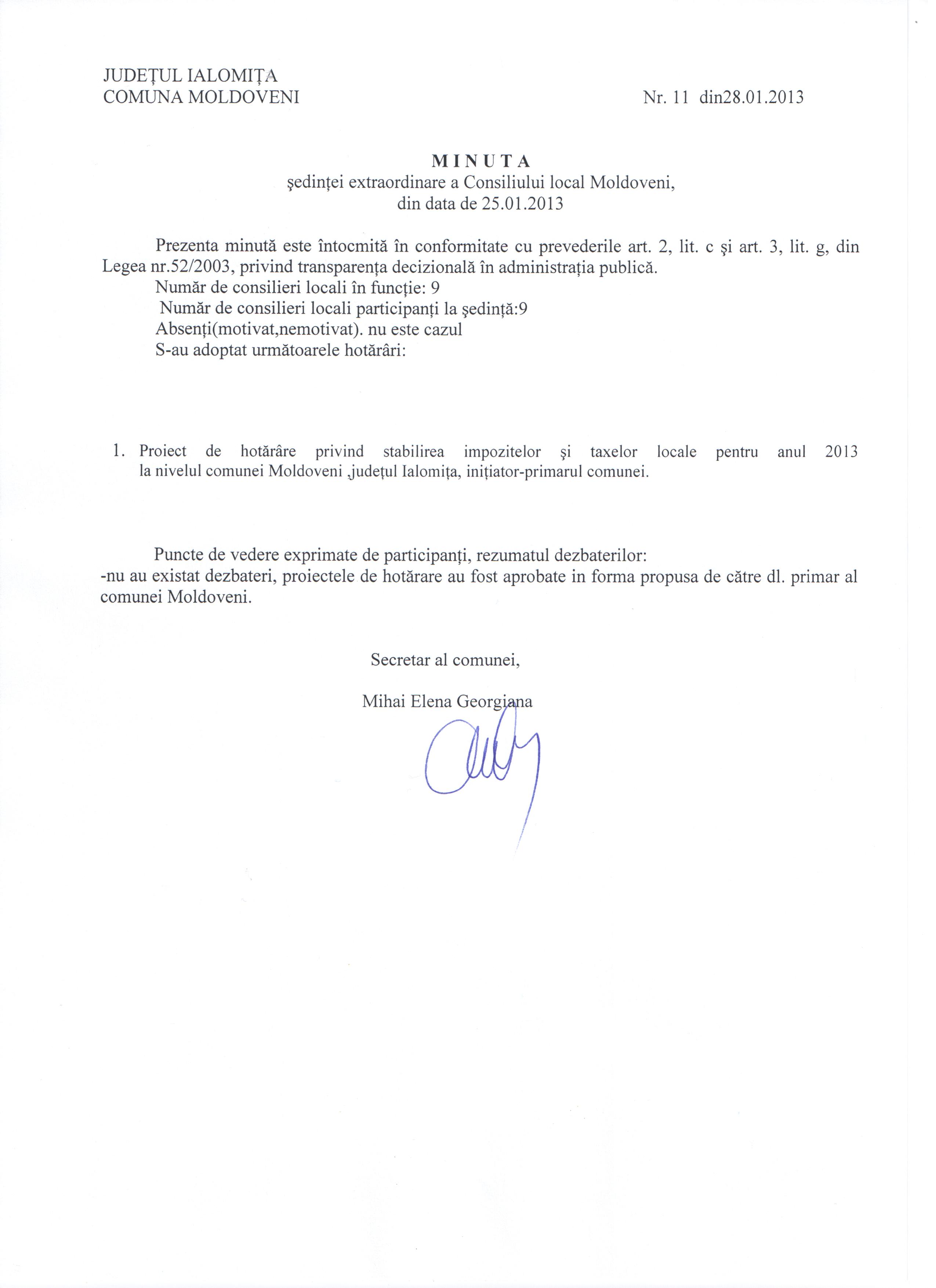 - Hot. nr. 07/25.01.2013 privind stabilirea impozitelor si taxelor locale la nivelul comunei Moldoveni, jud. Ialomita.
