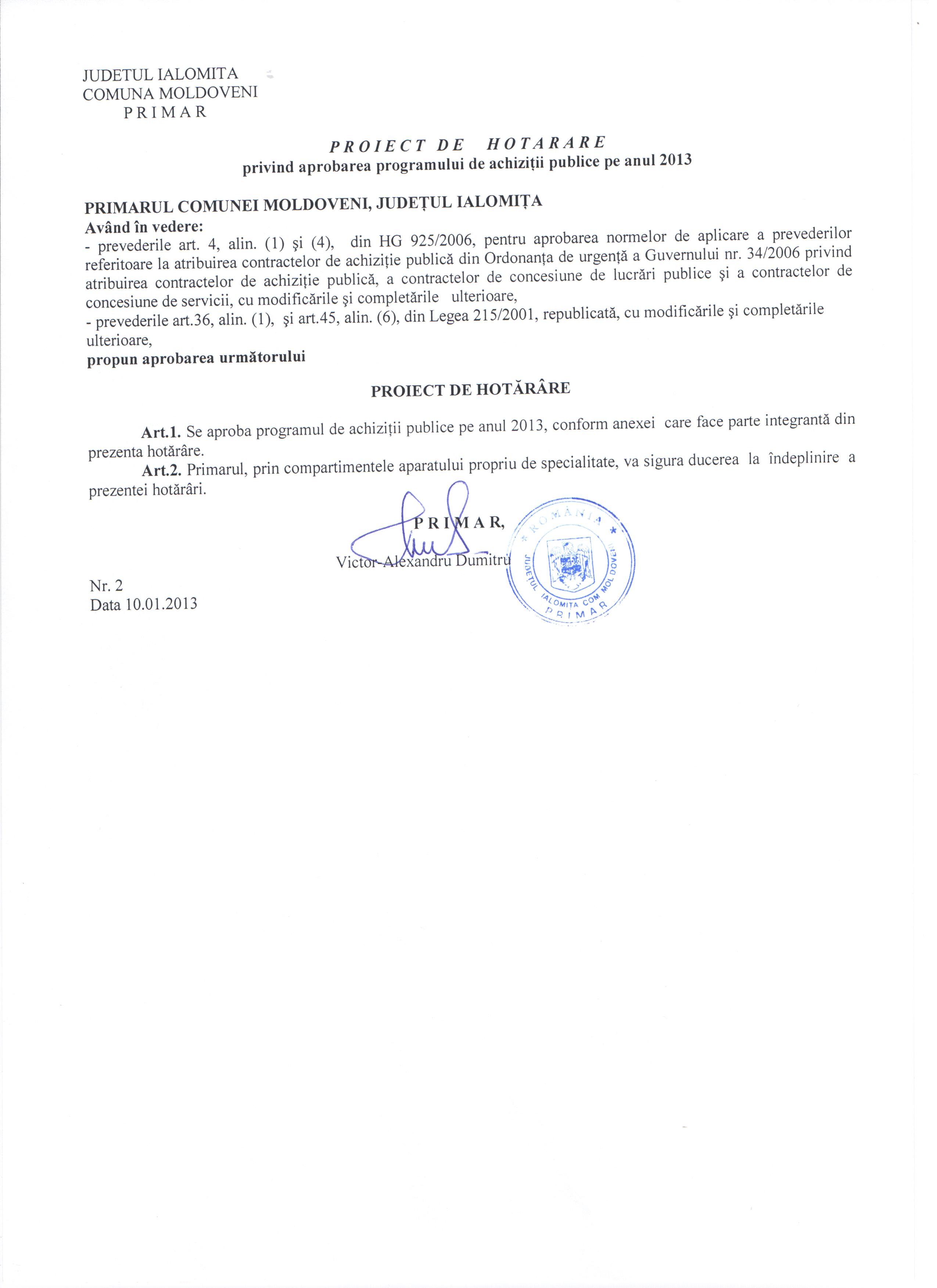 - Hot. nr. 02/18.01.2013 privind aprobarea planului de achizitii publice pe anul 2013.