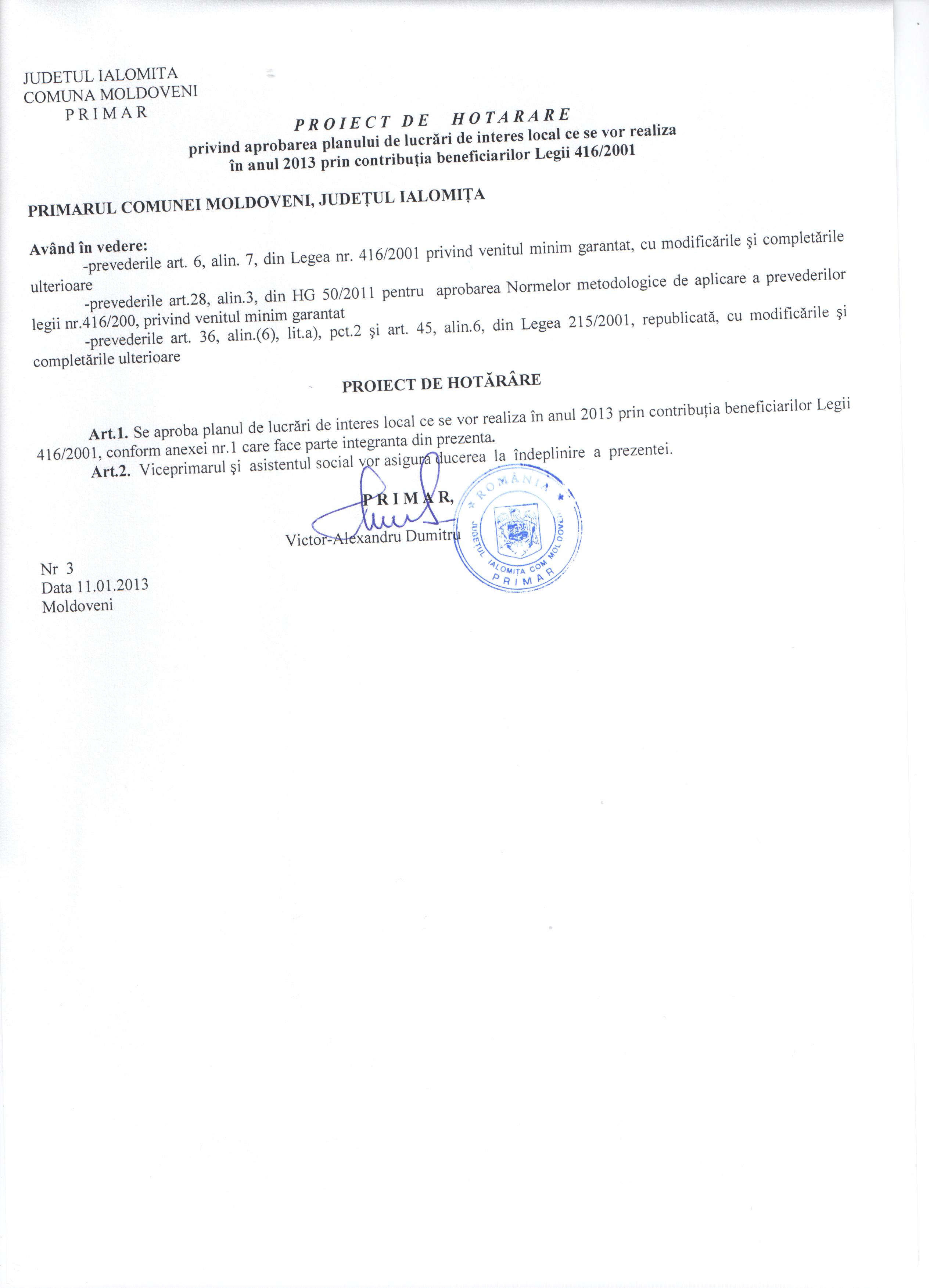 - Hot. nr. 03/18.01.2013 privind aprobarea planului de lucrari de interes local ce se vor realiza in anul 2013 prin contributia beneficiarilor Legii 416/2001.